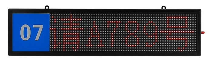 LED窗口屏为排队叫号系统配件,安装在办事大厅的窗口上方,用于显示窗口办理的业务名称和当前呼叫的票号,用户可以根据窗口的宽度和现场环境灵活选择不同的型号尺寸。通常建议选择单行八字屏,可以显示类似于“①请A001到02号窗”的字样,用户也可以选择双行窗口屏,第一行显示窗口编号和业务名称,第二行显示当前呼叫的票号。
