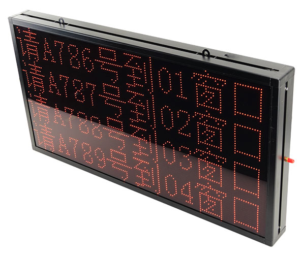 LED综合屏为排队叫号系统配件,安装在办事大厅的等候区,用于显示所有窗口当前呼叫的票号,用户可以根据等候区的宽度和现场环境灵活选择不同的型号尺寸。通常建议选择四行八字屏,可以显示四行类似于“请A001到02号窗口”的字样。综合屏显示的内容用户可以根据需要在排队系统主机进行设置,包括显示的文字、显示效果、滚动速度等都可以在后台进行修改。